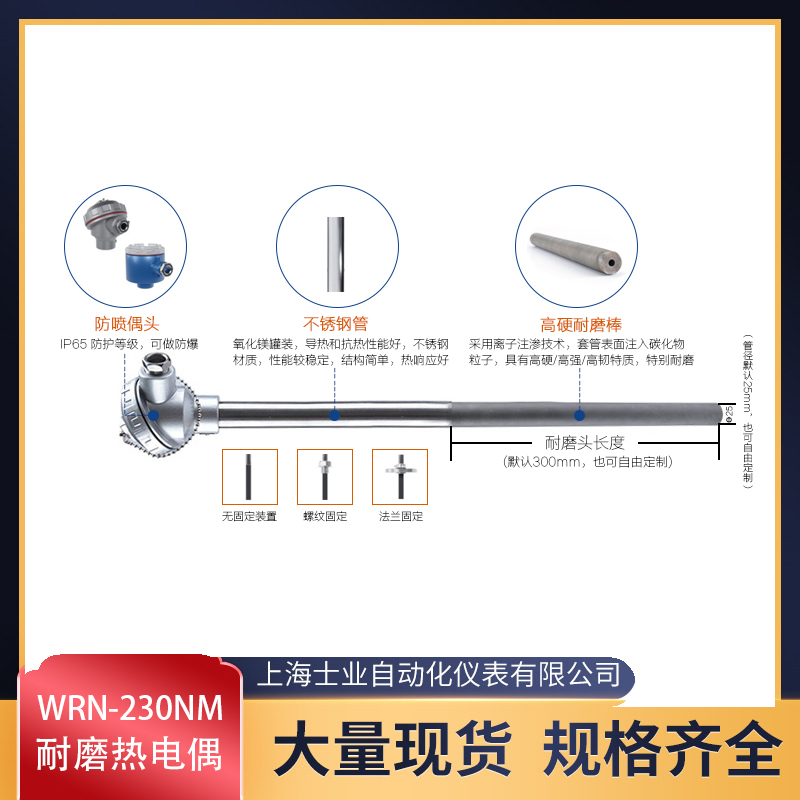 耐磨熱電偶適用于電廠球磨機(jī)及磨煤機(jī)等對(duì)保護(hù)管磨損嚴(yán)重的場合。?具有抗振,耐磨,耐腐蝕,靈敏度高,穩(wěn)定性好等優(yōu)點(diǎn);