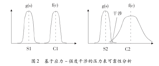 假設(shè)壓力表零件的強(qiáng)度為C,所受的應(yīng)力為S,它們 都是隨機(jī)變量,并且概率密度函數(shù)分別為f (c)與g (s)。 當(dāng)兩個(gè)分布的方差很小時(shí),零件強(qiáng)度的最小值大于應(yīng)力 的最大值,能夠保證一定的安全裕度。壓力表投入使用 后,盡管產(chǎn)品質(zhì)量、承受載荷、環(huán)境溫度、環(huán)境振動(dòng)、材料 腐蝕等因素的影響帶有隨機(jī)性質(zhì),但總體趨勢(shì)使得零件 的強(qiáng)度C逐漸下降,偏離設(shè)計(jì)時(shí)的理想?yún)^(qū)間,導(dǎo)致f (c) 與g(s)曲線出現(xiàn)重合,最終產(chǎn)生故障。