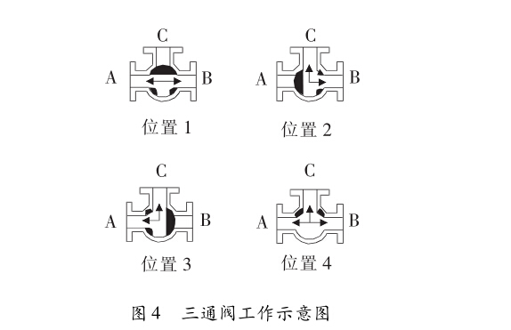 三通閥A端與壓力源管路相連,B端與壓力表相連, C端為內(nèi)螺紋接口,C端一般與泄壓管路相連。通過轉(zhuǎn) 動(dòng)旋鈕,可以使三通閥內(nèi)的閥芯處于不同位置,進(jìn)而使三 通閥的不同端口相通。