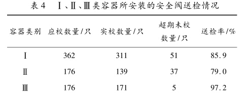 表4是將2013 ~2015年的壓力容器定期檢驗報告按容 器類別進行分類。m類壓力容器安全閥的送檢率顯著高于 I、II類壓力容器。