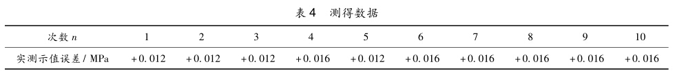 對一塊0~ 1.6 MPa、1.6級的壓力表在0.8 MPa點處做10次重復性測量,測得數(shù)據(jù)如表4 所示。