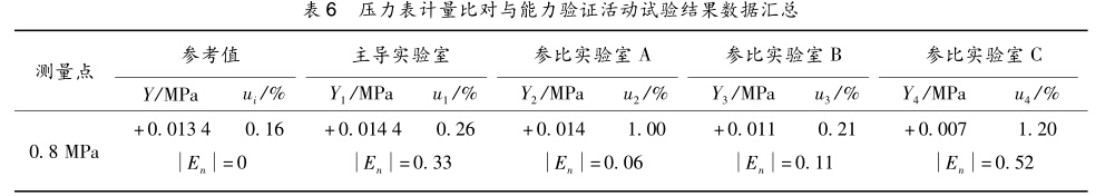 用上式計算:I En |忘1 ,則表明參加比對單位 的結果滿意,否則為不滿意。各參加比對單位壓 力表能力驗證試驗結果數(shù)據(jù)如表6和圖2所示.