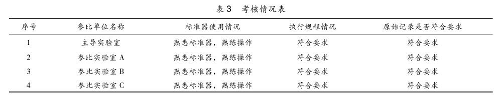 現(xiàn)場由比對專家組對參比實驗室的技術人員 進行現(xiàn)場考核,主要是從標準器的使用情況、執(zhí) 行規(guī)程情況、原始記錄是否正確完整等3個方面 進行考核??己饲闆r如表3所示。