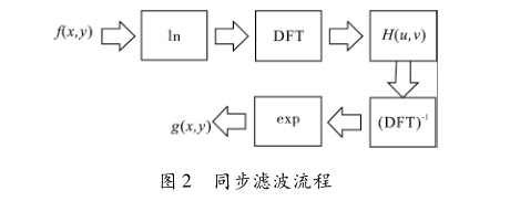 圖2中,()為原始圖像,ln表示對數(shù)運算, DFT表示傅里葉變換,H (u,v)表示頻域濾波過程, (DFT) -1表示傅里葉逆變換,exp表示指數(shù)運算,g (x, y)為同態(tài)濾波的結(jié)果。