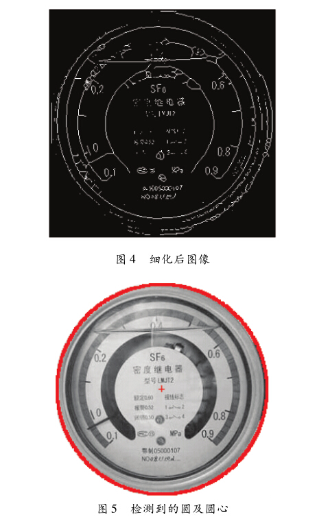 儀表盤是圓形的,其圓心是固定的,且必然在指針 軸心的直線上,因此,為了避免指針較粗時出現(xiàn)檢測到的直線不經(jīng)過指針軸心或者檢測到非指針的情況,可 先找出儀表盤的圓心,然后濾除到不經(jīng)過圓心的直線。 圓可通過Hough變換檢測得到。圖5中,“ + ”號為檢 測到的圓心,儀表盤邊緣的紅色線為檢測到的圓。