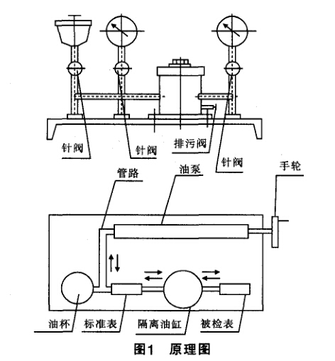 筆者從事檢定工作多年,每年為本區(qū)企事業(yè)單位 檢定壓力表達上萬塊。檢表過程中,由于廠家送來的 壓力表彈簧管中存在大量雜物,在搖表過程中,表中 雜物經(jīng)常抽到校驗儀套筒油缸內(nèi),時間一長,壓力表 校驗儀單向閥堵塞及活塞與缸筒經(jīng)雜泥磨損漏油,不 能保壓。活塞皮碗及活塞筒滲油泄漏,需經(jīng)常維修,損 壞嚴重的需要購買新的手搖泵。工作繁瑣且浪費時 間,因此筆者在壓力表校驗儀管路中加了一個油路隔 離缸,從而解決了油路經(jīng)常堵塞及活塞筒漏油的難 題,避免了手搖泵的更換,大大提高了工作效率,保證 了壓力表檢定調(diào)修的準確可靠。