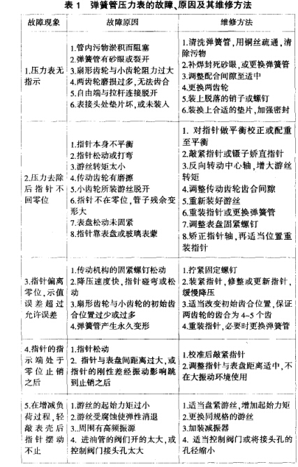針對彈簧管式壓力表在抬;修中存在故障判斷難、調(diào)修效率低的問題,筆者根據(jù)自己多年實際維修經(jīng)驗,總結(jié)匯總了彈簧管壓力表 的故障現(xiàn)象及排除方法,為提高故障判斷準確率和調(diào)修效率提供經(jīng)驗共享。