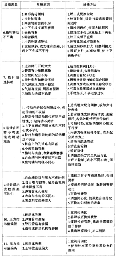 彈簧管式壓力表在使用中,由于振動、腐蝕、磨損、變形、灰塵、油 污等多種原因,使其計量性能發(fā)生變化、損傷精度、產(chǎn)生超差,故障形 式繁多,通常帶有多種故障并存,相互影響,故障分析判斷技術(shù)是調(diào)修 處理的基礎(chǔ),技術(shù)水平高低直接關(guān)系工作效率的髙低。筆者在多年的 工作中對故障判斷及調(diào)修方法進行了匯總,詳見下表。