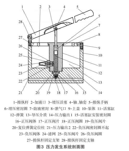 該技術(shù)在于把復(fù)雜的、分散的壓力發(fā)生系統(tǒng)進(jìn)行 科學(xué)的、適用的集成,特別是在單向閥體、閥片方面進(jìn) 行創(chuàng)新,一個鏡面的不易結(jié)垢的金屬薄片材料,用線切 割的方法,加丁成同心圓形的,四面帶有對稱弧面缺口 的閥片,該閥片在單向閥腔內(nèi)由4個突出于弧面的棱角 定位,其鏡面與密封圈緊密配合,當(dāng)閥片兩側(cè)形成壓力 差時,該閥片在單向閥腔內(nèi)的定位空間內(nèi)沿閥片中心 點(diǎn)軸心直線動作,實(shí)現(xiàn)開關(guān),導(dǎo)壓介質(zhì)通過閥片弧面缺 口單方向輸出發(fā)生壓力。單向閥分別正反向安裝于活 塞腔的側(cè)面和底部,導(dǎo)壓介質(zhì)儲液倉設(shè)計于泵體與增 壓缸體間,增壓活塞有平面和側(cè)面兩道密封安裝與泵體底部,設(shè)計有注液口、泄氣塞、操縱桿固定軸的上蓋 由密封圈、定位槽限制,用內(nèi)六角螺栓安裝于泵體上, 操縱桿與增壓活塞的作用點(diǎn)設(shè)計有滾動軸套用滾動軸 裝配于操縱桿上。見圖3壓力發(fā)生系統(tǒng)剖面圖。安裝 于泵體底座的增壓缸體11,緊密配合于增壓缸體11內(nèi) 的增壓活塞3,操縱桿1在操縱手柄5的作用下,安裝與 操縱桿1的軸套4,帶動增壓活塞3,以增壓缸體軸心為 直線向下運(yùn)動,增壓缸體11內(nèi)的導(dǎo)壓介質(zhì)13推開正壓 閥體16內(nèi)的正壓閥片17輸出,操縱桿1在操縱手柄5 外力釋放時,增壓活塞3在復(fù)位彈簧12的作用下返回 上始點(diǎn),增壓缸體11內(nèi)形成負(fù)壓,導(dǎo)壓介質(zhì)13推開負(fù) 壓閥體23內(nèi)的負(fù)壓閥片25輸人增壓缸體11,如此循環(huán) 作用,設(shè)計于泵體10內(nèi)儲液倉的導(dǎo)壓介質(zhì)13連續(xù)通過 輸出I 14和輸出H21排出,實(shí)現(xiàn)造壓。