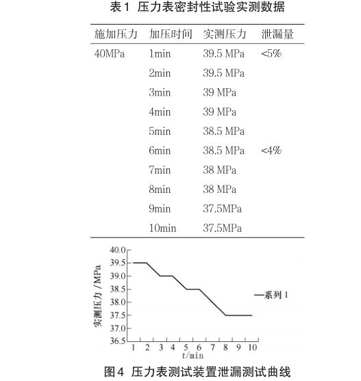 檢定規(guī)程中對壓力表校驗(yàn)器的規(guī)定,加壓5min后 開始計時,5min的泄漏量不得超過滿量程的4%。壓力 表密封性試驗(yàn)實(shí)測數(shù)據(jù)見表1,壓力表測試裝置泄漏測 試曲線見圖4。