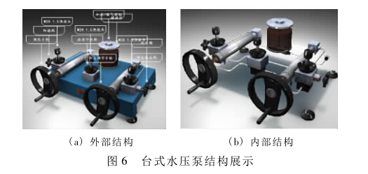 虛擬仿真系統(tǒng)開發(fā)完成之后,以.exe格式文件發(fā) 布,雙擊該文件進入系統(tǒng),首先根據(jù)屏幕分辨率選擇窗 口大小,然后進入主界面,學員可以選擇學習臺式氣壓 泵或者臺式水壓泵或者精密壓力表的結構原理、三維 視頻和進行實操練習,結構原理講解和三維視頻學習 是掌握實操方法的基礎,學生只有認真學習了前兩部 分之后才能夠順利進行虛擬實操,在實操練習過程中 只有當前步驟操作正確才可以進入下一步的操作,例 如臺式氣壓泵檢定壓力表的過程中,只有將標準表和 被檢表都安裝在對應接頭上并且關閉截止閥和卸壓閥 時才可以進行加壓操作。而在結構原理部分不僅可以 展示設備的外部結構而且可以顯示其內部結構組成, 臺式水壓泵的外部結構和內部結構展示見圖6。