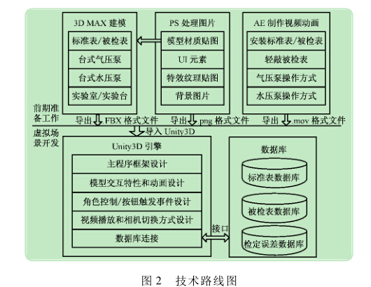 在前期的準備工作中,首先運用3Dmax軟件建立 臺式氣壓泵、臺式水壓泵、標準表、被檢表,實驗室和實 驗臺的三維模型,模型在達到一定精細度的基礎上面 片數(shù)應盡量少,特別是像臺式水壓泵這樣結構復雜的 模型,減少面片數(shù)的方法包括刪除看不到的面和減少 面的分段數(shù),以減輕硬件負擔,從而減少應用程序啟動 時場景加載的時間M。同時米用Photoshop圖片處理 軟件制作模型的材質貼圖、Unity3 D中的材質紋理貼 圖、特效貼圖和UI貼圖等,制作所需大小和分辨率的 圖片,保存為.png格式文件,并存放在Unity3D的資產 文件夾中。并利用Adobe After Effects圖形視頻處理 軟件制作模型動畫視頻,包括往快接頭上安裝標準表 和被檢表的視頻、輕敲被檢表的視頻、氣壓泵和水壓泵 的操作步驟講解視頻等。最后,為視頻加上配音和片 頭導出為.mov格式文件,放入Unity3D的資產文件夾 中,在Unity3D系統(tǒng)開發(fā)過程中使用。