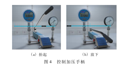 通過以上算法實現(xiàn)了加壓手柄移動帶動連桿移動 的目的。仿真效果如圖4所示,圖(a)和(b)分別表示 加壓手柄抬起和放下的狀態(tài),中間為藍色控制條,滑動 上面的黑色滑塊可以控制加壓手柄的抬起和放下狀 態(tài),以及抬起放下的高度大小。