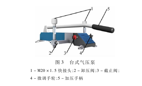 在壓力表檢定過程中,需要有一個穩(wěn)定的壓力提 供源來實現(xiàn)加壓和減壓,本仿真的臺式氣壓泵就是一 個采用壓桿式設計的氣體壓力源。如圖3所示, 臺式氣壓泵由兩個標準的M20 X1.5快接頭、截止閥、 加壓手柄、微調手輪、壓力真空轉換閥、卸壓閥組成。 左側快接頭安裝精密壓力表標準裝置,右側快接頭安 裝被檢壓力表,通過按壓加壓手柄實現(xiàn)加壓,微調手輪 實現(xiàn)對壓力的微調,壓力真空轉換閥實現(xiàn)對真空表檢 定和壓力表檢定的轉換,卸壓閥用來降壓,截止閥用來 連通和截止氣道。