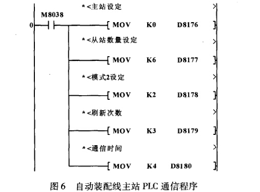 (1)主站485通信程序。三菱PLC485通信在硬 件上需要在PLC主機上加裝FX2N485-BD通信擴展 板,在程序起始位置編寫相應的通信程序。對于主站 通信程序,需要在相應的特殊數據寄存器里寫人從站 數量、通信模式、刷新次數和通信時間,同時在特殊 數據寄存器D8176寫入K0,表明主站身份。各從站 PLC程序在起始位置只需編寫一條表明從站號的通信 程序。主站PLC通信程序如圖6所示。