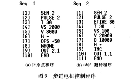 壓力表機芯自動裝配線共用到了5類電機,分別 是鉚壓用普通三相異步電機、輔道傳動鏈驅動用變頻 電機、主道傳動鏈驅動用伺服電機、左右輸送模塊用 電缸和下夾板支柱鉚壓及供給單元翻轉機構驅動用步 進電機。鉚壓用普通三相電機只需PLC輸出控制交 流接觸器線圈即可;變頻電機由三菱FR-E740變頻 器驅動,PLC輸出通過選通變頻器“正轉啟動STF”、 “高速RH”和“中速RM”端子實現速度切換;主 道傳動鏈驅動用伺服電機控制程序通過三菱FX1N PLC定位指令實現。左右輸送模塊用電缸采用SMC 株式會社LEC系列電缸,該電缸可采用絕對位移控 制和相對位移控制,其控制程序可在ACTCcmtroller 軟件環(huán)境下編寫并下載至電缸驅動器,驅動器可存儲 64步程序,PLC通過選通電缸驅動器“啟動”、“程 序步選擇”端子信號調用相應的電缸控制程序;翻 轉機構驅動用步進電機選用日本ORIENTAL株式會 社ASC系列步進電機,該電機調速范圍大,控制精 度髙??赏ㄟ^計算機程序—附件—通信—超級終端 編寫步進電機控制程序并下載至EMP401控制器中, 圖9所示為步進電機控制程序。EMP401控制器中 可存儲32個電機控制程序。通過EMP401控制器來 控制步進驅動器,進而驅動ASC系列步進電機轉 動。同樣,PLC只需給EMP401控制器“啟動”、 “程序步選擇”端子選通信號即可調用相應的電機 控制程序。