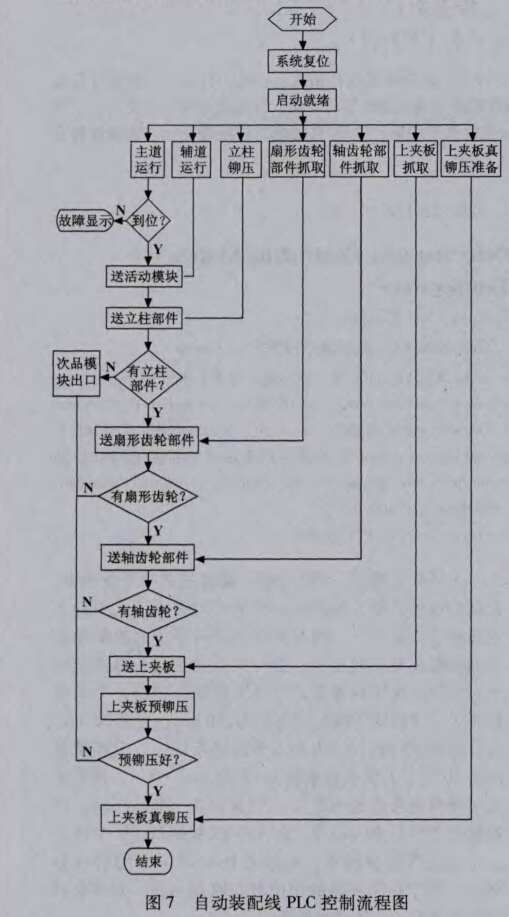 (2)自動運行子程序。整個自動裝配線流程圖 如圖7所示。在主傳動鏈運行254 mm到位后,通過 左輸送電缸把活動模塊從輔道傳動鏈傳送至主道傳動 鏈工位1;工位17的活動模塊由右將電缸輸送到上 夾板真鉚壓抓取位置或次品處理位置;原來主道傳動 鏈上已經存在的活動模塊隨主道傳動鏈運動移至后一 工位。各裝配工作單元根據檢測工位檢測的信息,決 定是否向主道傳動鏈活動模塊供料。主道傳動鏈及各 裝配工作單元開始時都獨立工作,主道傳動鏈運行到 位后,其控制PLC向各裝配工作單元PLC發(fā)出請求供料申請,各裝配工作單元先期動作完成后處于待命 狀態(tài),在接到主站PLC請求供料信號后向活動模塊 供料,供料完成后向主站PLC發(fā)出供料結束信號, 主道傳動鏈和各裝配工作單元開始新的動作周期。