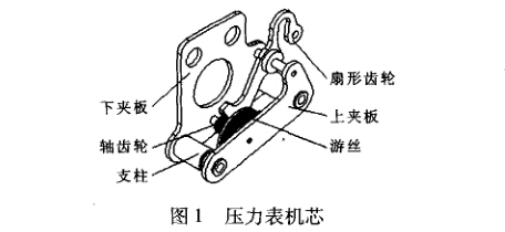 壓力表(pressure gauge) '是指以彈性元件為敏感 元件,測量并指示高于環(huán)境壓力的儀表⑴。壓力表的 應用極為普遍,它幾乎遍及所有的工業(yè)流程和科研領 域。在熱力管網、油氣傳輸、供水供氣系統、車輛維 修保養(yǎng)廠店等領域隨處可見。尤其在工業(yè)過程控制與 技術測量過程中,由于機械式壓力表的彈性敏感元件 具有很高的機械強度以及生產方便等特性,使得機械 式壓力表得到越來越廣泛的.應用。壓力表機芯是壓力 表專用的傳動放大機構,由軸齒輪、扇形齒輪、游絲 以及包括上、下夾板和支柱構成的機架等組成,如圖1 所示壓力表機芯是壓力表核心部件,其裝配品質 的好壞直接影響壓力表示值的精度等級。壓力表機芯 自動裝配線的研制與應用可有效提高壓力表機芯裝配質量的穩(wěn)定性,提高裝配生產的效率,降低生產成本。