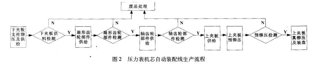 根據壓力表機芯的生產工藝,該生產線主要由下 夾板支柱鉚壓及供給、下夾板供料檢測、扇形齒輪部 件供給、扇形齒輪部件檢測等10道工序組成。生產 流程如圖2所示。