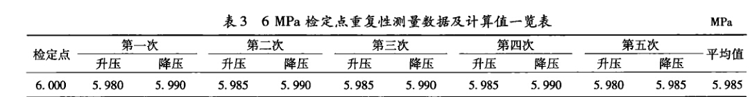 1)利用實(shí)驗(yàn)標(biāo)準(zhǔn)偏差評(píng)定方法 為分析測(cè)量重復(fù)性引人的不確定度分量,需要對(duì) 表2中的測(cè)量數(shù)據(jù)進(jìn)行分析,選取測(cè)量數(shù)據(jù)變化較大 的6 MPa點(diǎn)位觀測(cè)點(diǎn),進(jìn)行5次重復(fù)測(cè)量,每次均包 含升壓和降壓過(guò)程,共記錄10個(gè)測(cè)量值進(jìn)行分析,重 復(fù)測(cè)量數(shù)據(jù)如表3所列。