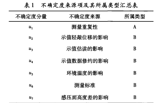 精密壓力表示值誤差的不確定度項(xiàng)來(lái)源及其所屬 不確定度類型如表1。