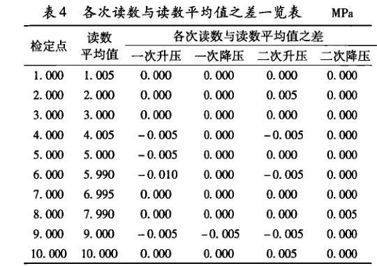 根據(jù)規(guī)范測(cè)量中合并樣本標(biāo)準(zhǔn)差的概念,首先計(jì) 算出表2中被檢精密壓力表各點(diǎn)讀數(shù)與其平均值之差, 如表4。