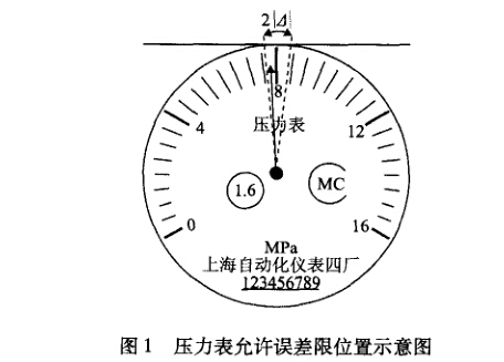在對(duì)一塊壓力表檢定之前先計(jì)算出壓力表的最大 允許誤差(也稱為壓力表的允許誤差限),并由此確定 其在壓力表檢定點(diǎn)標(biāo)度線附近所處位置,由于最大允 許誤差既有正值又有負(fù)值,所以允許誤差限的位置以 檢定點(diǎn)標(biāo)度線為軸對(duì)稱,見圖1。圖中虛線為該壓力 表允許誤差限,1.6為壓力表準(zhǔn)確度等級(jí),其誤差為滿 量程的1. 6%。