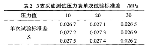 任意選取3塊同類型的采油測試壓力表,每塊 在30、20、lOMPa連續(xù)測10次,共得9組測量列,每 組測量列分別按公式(1)計算得出的單次試驗標(biāo)準(zhǔn) 差,如表2所示。
