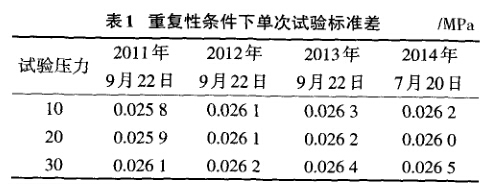 在工作溫度為(20±5)T、相對濕度專85%的校 準(zhǔn)環(huán)境條件下,選一支相對穩(wěn)定測量范圍為0? 30MPa、準(zhǔn)確度等級為1.0級的采油測試壓力表。在 重復(fù)性條件下,用該裝置在被測壓力表測量范圍內(nèi) 選取30、20、10MPa 3個壓力點,每年進(jìn)行10次獨立 重復(fù)測量。