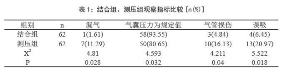 兩組的維護(hù)時(shí)間為一周,比較結(jié) 合組、測壓組維護(hù)規(guī)定氣囊壓力的患者 例數(shù),兩組患者的規(guī)定氣奨壓力值為 25cinH2CK30cmH20,在此范圍之外的氣囊 壓力均需要進(jìn)行調(diào)整:同時(shí)比較在規(guī)定氣 囊壓力下氣囊發(fā)生漏氣的例數(shù)。
