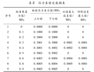 現(xiàn)場(chǎng)用SR密度繼電器對(duì)一只型號(hào)為 Const 211的0. 1級(jí)壓力表按照檢定規(guī)程進(jìn)行校準(zhǔn),數(shù) 據(jù)如表1所示。在實(shí)驗(yàn)室用0.02級(jí)的一等標(biāo)準(zhǔn) 活塞式壓力計(jì)對(duì)該壓力表按照壓力表檢定規(guī)程進(jìn) 行檢定,檢定結(jié)果如表2所示。