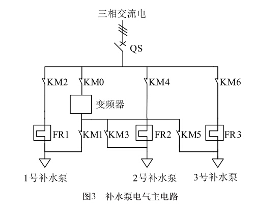 鍋爐補(bǔ)水泵多采用一用一備的兩臺(tái)泵工作方 式,也有采用多用一備的方式,本文以兩用一備 的三臺(tái)泵方式為例進(jìn)行介紹。為了在變頻器故障 時(shí)補(bǔ)水泵仍能為鍋爐補(bǔ)水,所設(shè)計(jì)的電路應(yīng)包括 變頻運(yùn)行和工頻運(yùn)行兩部分,通過轉(zhuǎn)換開關(guān)進(jìn)行 切換。圖3給出了三臺(tái)泵的主電路圖。