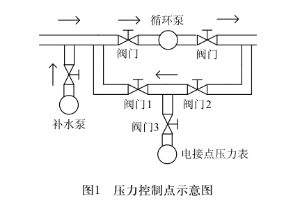 供熱采暖鍋爐補(bǔ)水泵應(yīng)保證整個(gè)供熱系統(tǒng)充 滿水,管網(wǎng)內(nèi)不進(jìn)空氣,避免影響供暖質(zhì)量。許 多文獻(xiàn)介紹的壓力采樣點(diǎn)在熱水循環(huán)泵的入口 處,其特點(diǎn)是當(dāng)循環(huán)泵運(yùn)行時(shí),其入口壓降低, 需要的補(bǔ)水壓低,補(bǔ)水泵變頻器輸出頻率低,補(bǔ) 水泵轉(zhuǎn)速無需太高即可滿足所要求的壓力,其原 因是利用了循環(huán)泵的吸程。當(dāng)循環(huán)泵停止運(yùn)行 時(shí),其入口壓升高,超過了所設(shè)定的壓力,補(bǔ)水 泵停止運(yùn)行。一旦循環(huán)泵停止運(yùn)行,其出口壓會(huì) 降低,極易造成建筑物最高處缺水而進(jìn)氣,從而 影響用戶采暖。導(dǎo)致這一現(xiàn)象的原因是補(bǔ)水泵的 壓力控制點(diǎn)不夠合理,因而找到合適的壓力控制 點(diǎn)并對(duì)該點(diǎn)壓力進(jìn)行控制成為解決問題的關(guān)鍵。 合理的壓力控制點(diǎn)應(yīng)保證在循環(huán)泵停止運(yùn)行后供 熱管網(wǎng)內(nèi)不進(jìn)氣,不管循環(huán)泵是否運(yùn)行,管網(wǎng)內(nèi)都 應(yīng)充滿水,既不進(jìn)氣,補(bǔ)水壓又不是太高,以保證 供熱管網(wǎng)和暖氣片的安全,避免供暖設(shè)施和管路滲 漏。圖1中箭頭方向表示循環(huán)水流動(dòng)方向,閥門3處 為壓力采樣控制點(diǎn)。為了保證循環(huán)泵運(yùn)行與停止時(shí) 壓力控制點(diǎn)的壓力相同,可以通過調(diào)節(jié)閥門1和閥 門2的開度來實(shí)現(xiàn)。具體操作時(shí),應(yīng)使壓力采樣點(diǎn) 的壓力在循環(huán)泵運(yùn)行時(shí)比停止時(shí)略低, 這樣可以在 循環(huán)泵停止運(yùn)行后補(bǔ)水泵也停止運(yùn)行。