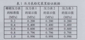 采用測量范圍為(0~2.5) MPa、準(zhǔn)確度等 級為0.25級的精密壓力表同時對3塊性能穩(wěn)定、 測量范圍為(0~ 1) MPa、準(zhǔn)確度等級為1.6級 的壓力表進(jìn)行校準(zhǔn),校準(zhǔn)結(jié)果的數(shù)據(jù)如表1所示。 從以上的數(shù)據(jù)可得出三個表的測量數(shù)據(jù)相差的數(shù)據(jù)最大只有0.002 MPa,該表的最大允許誤差 為0.016 MPa,不超過該表的最大允許誤差,同時利用公式丨x2-x1丨/x< W U, C/=1.2%,其中;Ci 和x2取壓力表1、壓力表2及壓力表3中的任意兩 組數(shù)值,義為精密壓力表的標(biāo)準(zhǔn)值,均能滿足公式 的要求,同時將三塊壓力表更換接口的位置,得到 的測量數(shù)據(jù)仍然保持不變。從而驗證了該次壓力表 檢定裝置改造后數(shù)據(jù)有效可靠。