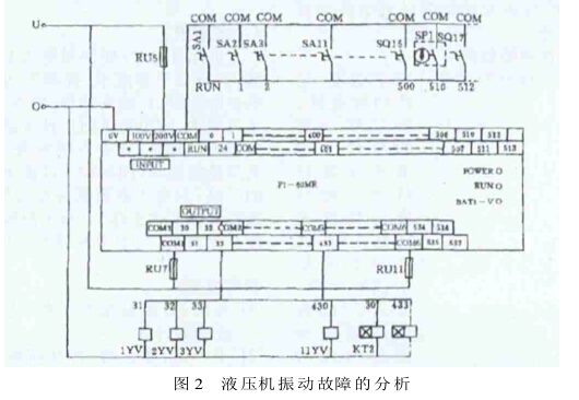 對(duì)液壓機(jī)振動(dòng)故障進(jìn)行查找分析,也 液壓機(jī)不同的部位采用不同的編號(hào)進(jìn)行標(biāo) 注,首先對(duì)液壓機(jī)的PC機(jī)進(jìn)行故障診斷,由 圖2顯示,30端口的指示燈沒有產(chǎn)生指示信號(hào),但是在510端口,其指示燈產(chǎn)生了指示 信號(hào),但是因?yàn)樾盘?hào)強(qiáng)度較弱,所以將PC機(jī) 的運(yùn)行確定為故障,為了進(jìn)一步的確定故 障,將PC機(jī)故障診斷程序進(jìn)行改變,將輸出 端口改為433,PC機(jī)的故障不僅沒有排除, 還更加確定PC機(jī)有故障,因?yàn)榇藭r(shí)的510指 示燈產(chǎn)生了指示信號(hào),信號(hào)的強(qiáng)度較弱,有 閃爍的現(xiàn)象。在對(duì)液壓機(jī)的電接點(diǎn)壓力表 進(jìn)行檢查之后,確定電接點(diǎn)壓力表合格,在 接入液壓機(jī),使液壓機(jī)處于工作狀態(tài)時(shí),電 接點(diǎn)壓力表的觸點(diǎn)閉合電阻達(dá)到了 200 k Q,嚴(yán)重的存在接觸不良問題,對(duì)這一現(xiàn)象 進(jìn)行診斷之后,發(fā)現(xiàn)是因?yàn)橐簤簷C(jī)在壓制 過程中壓力過大,造成液壓機(jī)的機(jī)身禪產(chǎn) 生振動(dòng),造成電接點(diǎn)壓力表觸點(diǎn)接觸不良, 觸點(diǎn)的電阻急劇增加,電壓下降,進(jìn)而造成 PC機(jī)沒有穩(wěn)定的電壓,而產(chǎn)生工作故障。