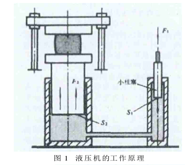 在機(jī)械制造中使用最多的機(jī)械是液壓 機(jī),液壓機(jī)有不同的類型、不同的用途,在 機(jī)械制造中可以用來進(jìn)行鍛壓、沖壓、冷 擠、壓裝等等,不同的液壓機(jī)在機(jī)械制造中 有不用的作用。在制造業(yè)也將液壓機(jī)成為 油壓機(jī),在機(jī)械制造中通過利用靜液壓對(duì) 金屬、木材、塑料等進(jìn)行加工。液壓機(jī)使用 的液體同,有的是水,有的是油,其中水壓 機(jī)產(chǎn)生的壓強(qiáng)非常大,所以經(jīng)常在機(jī)械制 造中用來進(jìn)行沖壓和鍛壓制造。(圖1) 所有的液壓機(jī)工作原理都是相同的, 都是在帕斯卡定律的基礎(chǔ)上完成制造的。 如上圖有兩個(gè)面積大小不同塞柱,分別是 S1和S2,在這兩個(gè)塞柱上的作用力大小分 分別為F1和F2,在壓強(qiáng)原理的基礎(chǔ)上,通過