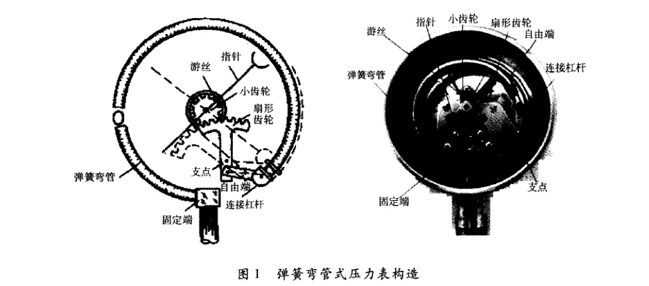 彈簧彎管式壓力表(圖1)主要由彈簧彎管、 連桿、扇形齒輪、小齒輪、中心軸、指針及表盤(pán)等組 成。彈簧彎管是由金屬管(無(wú)縫銅管或無(wú)縫鋼 管)制成的,管子截面呈扁圓形或橢圓形,它的一 端固定在固定端的支撐座上,與氣體介質(zhì)相通;另 一端是封閉的自由端,與杠桿連接。杠桿的另一 端連接扇形齒輪,扇形齒輪又與中心軸上的小齒 輪嚙合,壓力表的指針固定在中心軸上。
