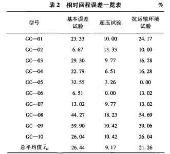 (2)抗運輸環(huán)境試驗的相對回程誤差值明顯 大于超壓試驗值而略小于基本誤差試驗值。說明 在經(jīng)過一段時間的自然時效及抗運輸環(huán)境試驗后, 彈性元件得到一定程度的回復,因此進行示值試 驗時能夠產(chǎn)生一定程度的殘余變形,導致回程誤 差增大。