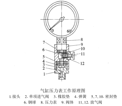一、氣缸壓力表結(jié)構(gòu)組成 氣缸壓力表總成由0?5. 88MPa量程的壓力表、 連接軟管、單項(xiàng)進(jìn)氣閥和適用于各種機(jī)型的可換接 頭等組成。其上有放氣閥,以便使指針回位到“0”。 其結(jié)構(gòu)見下圖。