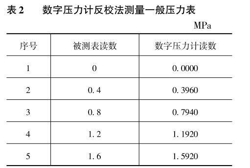 在壓力表的校準(zhǔn)過程中,反校法可以讀取某一 測量點(diǎn)的標(biāo)準(zhǔn)示值,而且突破了檢定規(guī)程中規(guī)定的 壓力表估讀分度值五分之一(精密壓力表為十分之 一)的限制,讀數(shù)更精確并且直觀,可以提高工作效 率。需注意的是,因反校法與常規(guī)方法讀數(shù)方式相 反,所以誤差也是正負(fù)相反的。例如測量一般壓 力表的1. 2MPa點(diǎn),用常規(guī)方法讀數(shù)為1. 208MPa, 如表1所示,而用反校法測量該點(diǎn),讀作為標(biāo)準(zhǔn)器 的數(shù)字壓力計(jì)為1.1920MPa,如表2所示。因此 在壓力表的校準(zhǔn)過程中,如果使用反校法,則出具 的校準(zhǔn)證書中應(yīng)說明校準(zhǔn)方法,避免誤差計(jì)算 錯(cuò)誤。