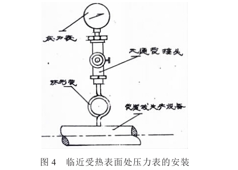 (6)壓力表不應(yīng)該直接安裝在臨近鍋爐以及類似設(shè) 備表面受熱的地方使用,若需要安裝在這些地方使用的 壓力表,其壓力表與管道相接之間必須要通過(guò)環(huán)形管和 三通管接頭,如圖4所示。
