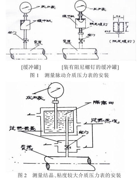 (2)被測(cè)介質(zhì)急劇變化或?yàn)槊}動(dòng)壓力時(shí),應(yīng)附加緩 沖罐或阻尼螺釘。如圖1所示,若需測(cè)量結(jié)晶或粘度較 大的介質(zhì)時(shí),需安裝隔離器,并應(yīng)設(shè)有過(guò)熱蒸汽裝置,如 圖2所示。