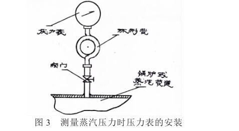 (3)測(cè)量蒸汽壓力時(shí),壓力表下端應(yīng)裝有環(huán)形管,如 圖3所示。并應(yīng)由水傳遞壓力,以免高溫蒸汽沖入壓力 表內(nèi),影響測(cè)量準(zhǔn)確性和損壞壓力表。