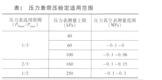 據(jù)壓力表、壓力真空表系列可知,壓力表最大上限 為0.25MPa;壓力真空表最大測(cè)量范圍為(-0.1 ~0.3)MPa 各選用原則可檢最大上限如表1所示。
