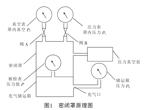 在圖1中,P是被檢壓力表標(biāo)稱值;A是密閉罩內(nèi) 產(chǎn)生的壓力或真空標(biāo)準(zhǔn)值(簡稱罩內(nèi)壓力真空值);A 是儲(chǔ)運(yùn)箱內(nèi)原有壓力真值,P。可用與標(biāo)準(zhǔn)器同準(zhǔn)確度 的測(cè)量儀從儲(chǔ)運(yùn)箱充氣口測(cè)得。由測(cè)量儲(chǔ)運(yùn)箱內(nèi)部壓 力而泄漏造成的儲(chǔ)運(yùn)箱氣壓改變?nèi)绮怀^規(guī)定范圍, 可以不予考慮。圖1中真空表、壓力表是用來測(cè)量密閉罩內(nèi)真空度及壓力標(biāo)準(zhǔn)值的。