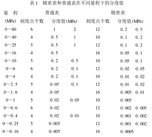 根據(jù)現(xiàn)有壓力表進(jìn)行統(tǒng)計(jì),得到精密表和普通表在不 同量程的分度值分別如表1所示。