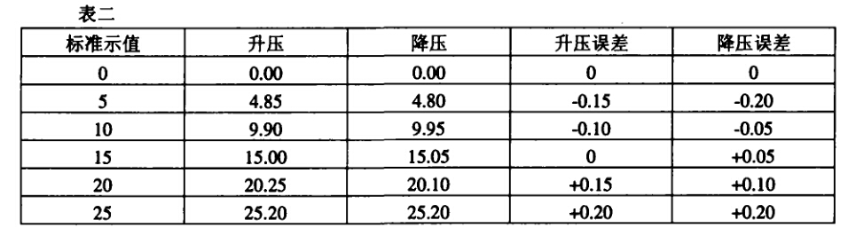 由表一可以看出,該壓力表經(jīng)檢定,最后一點的誤差為+0.75Mpa,已超差,此表不合格,需要調(diào)整到 誤差范圍內(nèi)。那么,該如何調(diào)整它?由該表誤差一欄中可以看出:誤差是隨示值的增大而不斷增大的,這 用前面所述的調(diào)整方法2,很快就可以解決此問題了。調(diào)整后重新檢定,其示值如表二所示: