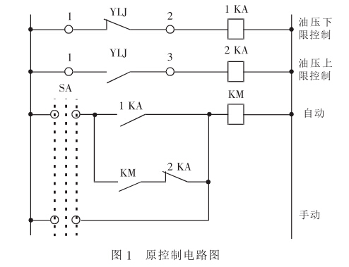 我電站調速器油栗電動機的控制裝置由電接點壓力表YLJ、中間繼電器1KA、2KA,接觸器KM等組成。其控制電路簡圖如圖1。