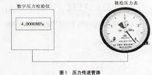 例如,使用數(shù)字壓力校驗(yàn)儀對(duì)一塊量程為4MPa,準(zhǔn) 確度等級(jí)為2. 5的壓力表進(jìn)行檢定時(shí),根據(jù)規(guī)程對(duì)壓力 表進(jìn)行示值誤差檢定,從零點(diǎn)幵始緩慢施壓至IMPa、 2MPa、3MPa、4MPa,在此過程中分別讀取壓力表的示值。 同樣,在測(cè)試最后一個(gè)檢定點(diǎn)時(shí),將壓力升壓直至標(biāo)準(zhǔn)器 的壓力值為4MPa,再讀取壓力表的示值,此刻,壓力表的 指針已超過最大量程4MPa(如圖1)。