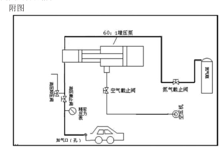 車用燃氣壓力表在線檢定裝置主要由以下設備組成:(見附圖)精 密壓力表、氮氣瓶、增壓泵、空壓機、各控制閥門、高壓氣體專用接口等。 基本原理或者說操作過程如下:利用空壓機輸出帶有一定壓力的空氣 到增壓機,使增壓機工作把從氮氣瓶輸出到增壓機的氮氣加壓到0到 40MPa的高壓(空壓機產生的較高壓力的空氣只是驅動增壓泵工作,不 會滲透到氮氣壓力管道中),高壓氮氣通過車用燃氣裝置的加氣口(孔孔〕 到達車用燃氣裝置壓力管道和各控制調節(jié)閥門,這樣高壓氮氣就能同 時傳遞到精密壓力表和車用燃氣壓力表,通過精密壓力表和車用燃氣 壓力表的示值對照就能檢定車用燃氣壓力表是否滿足規(guī)程要求,從而 判定其是否合格。